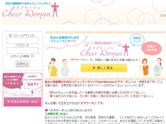 名称チアウーマン | 活動概要【SNSで仲間を作る!(乳がん対象)】 ①仲間が見つかる! ②役立つ情報が満載! ③乳がんLIFEを記録できる!をコンセプトに4,500名の登録者と13万件の書き込みの中からあなたの欲しい情報を探せます |