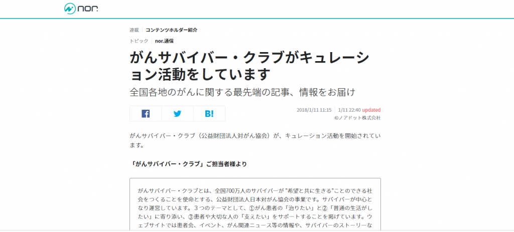 私たちが「がん関連注目ニュース」でご紹介している記事は、「nor.(ノアドット)様」を始め、各報道機関からリンク掲載の許可をいただいたもの、またはリンクの掲載が自由となっている媒体からのものとなります。