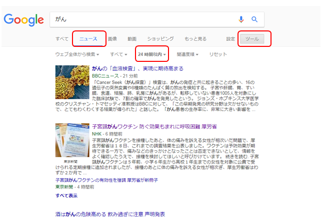 まず、絞込み機能を使って「ニュース」で絞り込むことで、メディア各社が記事にしている情報を絞り込むことができます。そうすると、匿名で作成されたブログ記事などの情報を排除することができ、信頼性が上がります。更に右上、「ツール」の部分で「24時間以内に取得した最新記事」など絞り込むことで、よりフレッシュな情報に限定することができます。