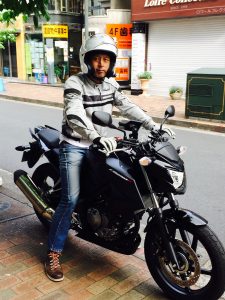 2015年5月3日、浩美さんの誕生日にバイクにまたがる哲也さん。(轟浩美さん提供)