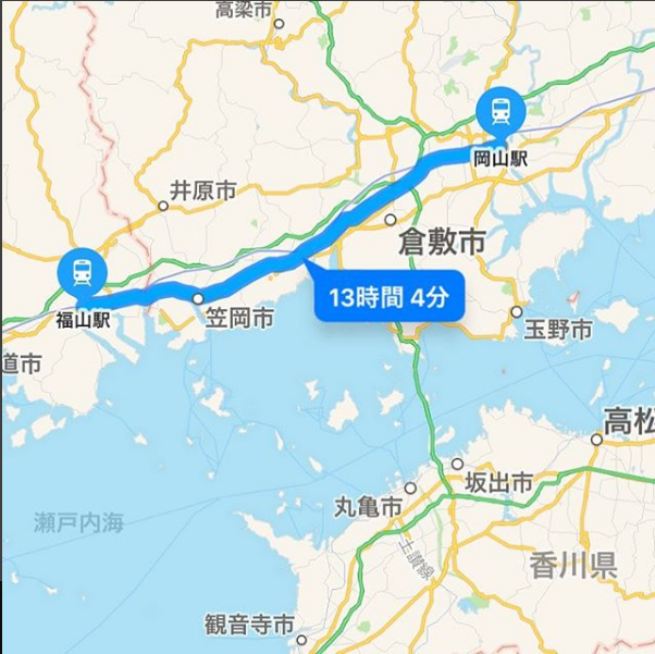 リュックに中国地方の地図を入れて、午前6時に東京駅を出る新幹線で出発しました。朝の光をわずかに受けた富士山がきれいです。9時半前に福山駅に到着しました。