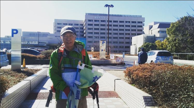 暖かい陽気のもと、栄のホテルから千種区の愛知県がんセンターまで約7キロを歩きました。日本対がん協会事務局長の岡本宏之と一緒です。