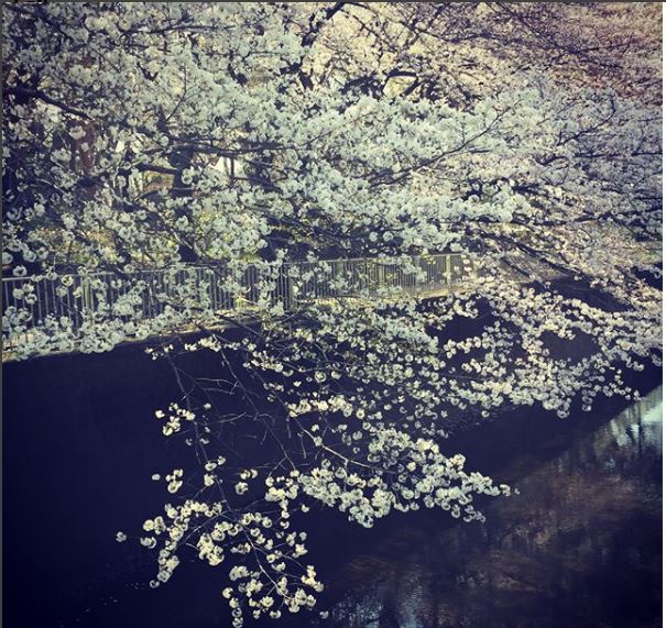 川の両側に満開の桜並木が続きます。伸びた枝が川面に映えています。赤い欄干の橋から眺めながら、春を思い切り吸い込みました。