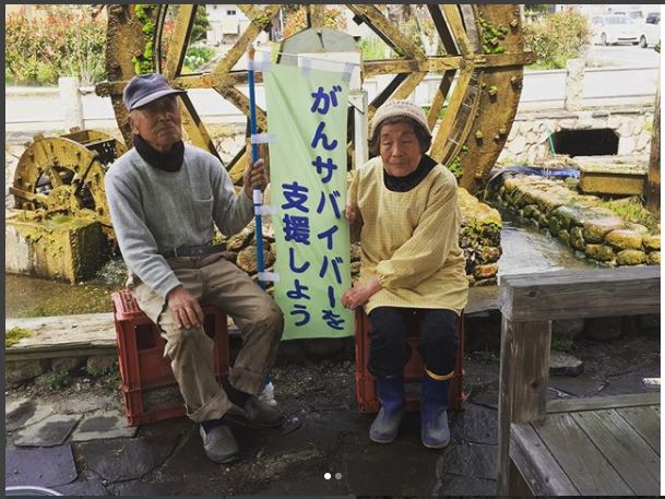 長浜では、琵琶湖畔を離れて内陸に向かう途中で、水車を見かけました。たまたまその水車を造ったおじいさんと出会いました。81歳で、喉頭がんと胃がんのサバイバーです。奥様も出てこられたので、幟を持ってもらい、写真を撮らせていただきました。ウォークの話をすると、「すごい旅行ですねえ」と驚いていました。