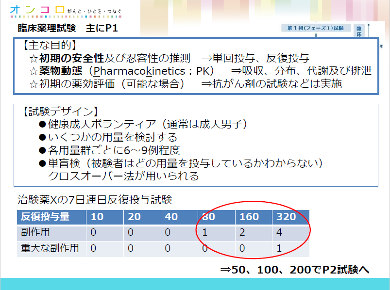 第1相は、初めて人に投与する試験です。主に安全性を調べます。だんだん投与量を増やし、副作用をチェックしながら、最大耐用量(どこまで投与できるか)を見ます。
