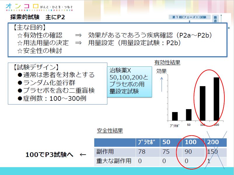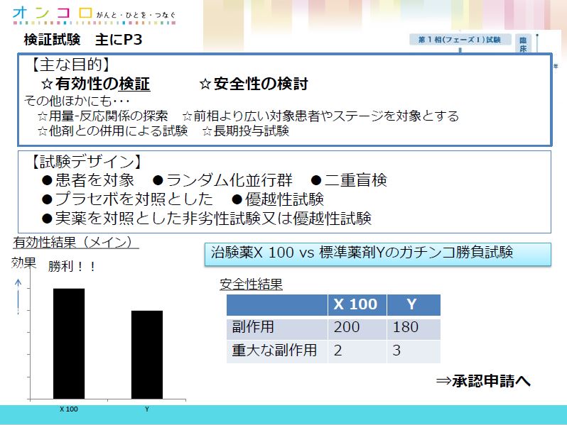 第3相は、有効性の検証です。既存の薬(標準治療)と比べて、新しい薬のほうがより効果があるかを調べます。無増悪生存期間、生存期間がどのぐらい伸びるか、がポイントです。第2相より多い300人から500人で実施します。「第3相でよい結果を得られたら、国に承認を申請します。逆に効果があるという結果が得られなければ、500億円かけて開発してきても、パーです」