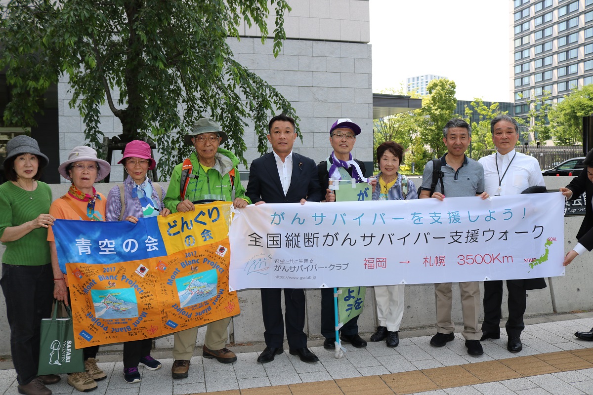 国会議事堂と道路を挟んだ衆議院議員会館の前に、駒込病院からウォークにご同行いただいた「どんぐりの会・青空の会」の旗と、「がんサバイバーを支援しよう」の横断幕を掲げました。外科医で在宅の緩和ケアにも携わっている中島克仁衆議院議員(民進党出身で今は無所属)が、駆けつけてくださいました。