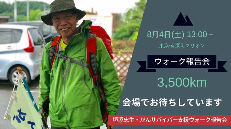 今年2月5日に福岡をスタートし、全国がんセンター協議会加盟32病院を歩いて回る、「垣添忠生 全国縦断がんサバイバー支援ウォーク」が7月23日の北海道がんセンターでゴールを迎えます。  8月4日、77歳、総移動距離3500キロに及ぶチャレンジの報告会を実施いたします。  道中、感動したり、深く考えたり、驚いたりしたエピソードも公開します。ウォークに参加できなかった方も一緒に追体験しませんか。  先着150名様まで。お早めにお申し込みください。 【開催情報】 開催日:2018年8月4日(土) 開催時間:13:00~15:30(開場12:30) 会場:有楽町マリオン 11階 スクエアホール       https://www.asahi-hall.jp/yurakucho/access/ 参加費:無料 定員:先着150名様まで。 ※ノーネクタイ、アウトドアのカジュアルな服装でお越しください 【プログラム】 13:00 開会 13:15 垣添忠生からの完歩のご報告 13:50 トークショー     ※旅路や頂いたご声援で印象深かった方をお招きし、      エピソードを公開します。 15:00 交流会・記念撮影(パネル展示・茶菓子をご用意しております) 15:30 閉会 お申込みはこちらからどうぞ。 https://ws.formzu.net/fgen/S72689064/ それでは会場でお待ちしています。
