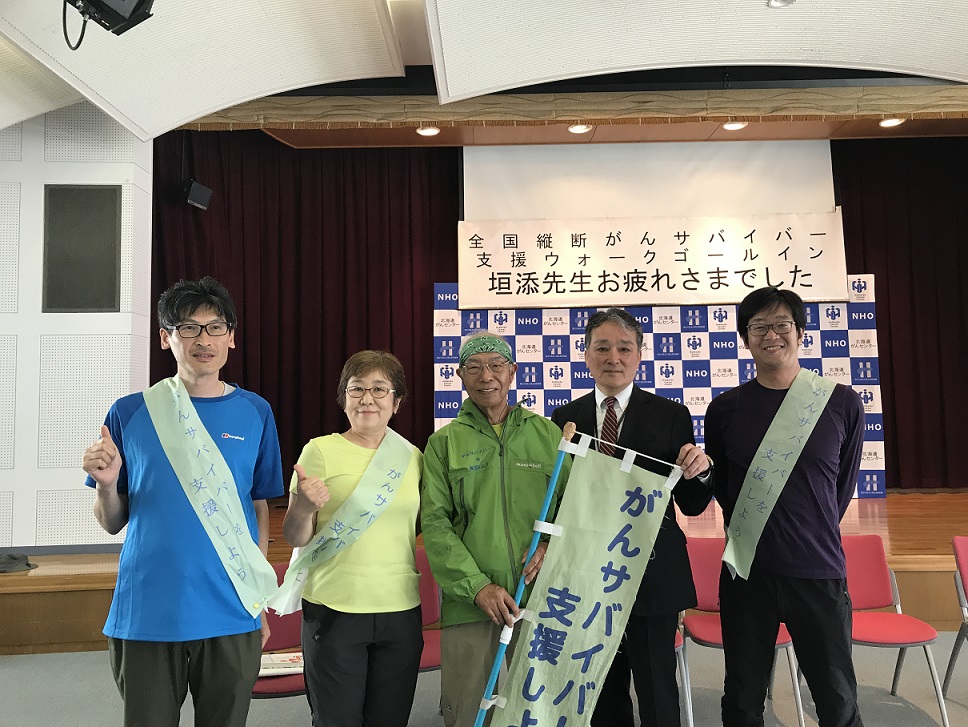 私は7月20日の夜、北海道倶知安町へ入り、翌21日から3日間、ウォークに同行しました。21日は、好天のもとをのんびりと留寿都(くるすつ)村へ。22日は、濃霧やときおりの霧雨の中、喜茂別(きもべつ)町と札幌市の境界に立つ中山峠へ。  一歩ずつ進み、五感を全開します。植物の名前を覚えると、風景が親密になります。合鴨農法らしき水田では鴨が3羽、働いていました。別荘用なのか、「757坪 FOR SALE」の看板の上に○で囲んだ「契」の字が。防寒対策でしょう、寺院の形も内地とは微妙に違います。  いずれも、車なら見過ごしていたか、一瞬の出来事でした。  田園地帯では、歩いている人にほとんど会いません。自動販売機すらありません。最終日、定山渓温泉から札幌の中心部へ向かったときには、「飲み物の心配をしなくていいんだ」と気が楽になりました。  歩行距離は約75キロ。53歳にして、人生でもっとも歩いた3日間でした。  歩くからこそ感じとれる、風景の息遣い。「がんサバイバー支援ウォーク」は同時に「ニッポン再発見の旅」でもある。そう思いました。 「歩くことは贅沢だ」。2月のウォーク開始以来、垣添から繰り返し聞いた言葉です。それにうなずくと同時に、やはり垣添が繰り返し述べていた、みなさんの支援がどれだけありがたく励みになったかも、実感できました。 ウォークのゴール、札幌市の北海道がんセンターで、日本対がん協会のメンバーと。右から事務局長の岡本宏之、理事長の後藤尚雄、会長の垣添忠生、参事の望月友美子、私(7月23日)。