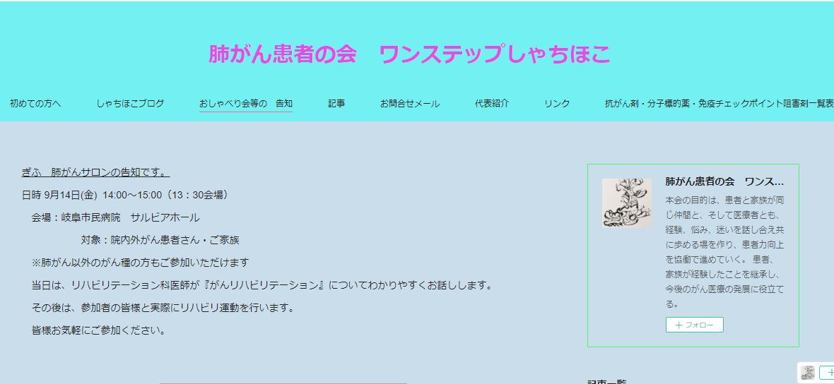 ホームページ 名称NPO法人 肺がん患者の会 ワンステップ 活動地域神奈川県・広域