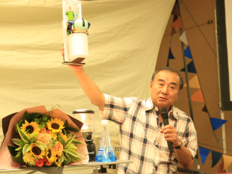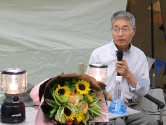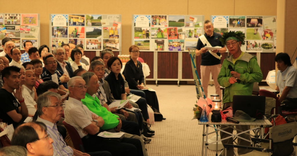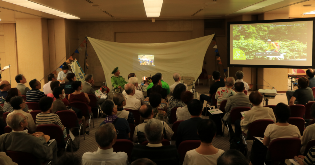 会場の正面奥には、キャンプ用の大きなテントが張られていた。  約130人の来場者が拍手で迎える中、月桂樹の冠をかぶった垣添忠生が登場し、リングに上がるボクサーのように客席の合間を進んだ。正面に到着した垣添に、秘書の森田幸子から花束が贈呈された。垣添が達成宣言をした。 「全国縦断がんサバイバー支援ウォーク3500キロ、無事完遂しました。みなさん、ありがとうございます!」  照明が落ちて、前方スクリーンに青森県を歩いていた際の映像が流れる。インクスの中村明夫さん、市谷雅裕さんが撮影してくれたもので、ドローンによる上空からの撮影まで入っている。会場が、一気にウォークの世界に浸っていく。
