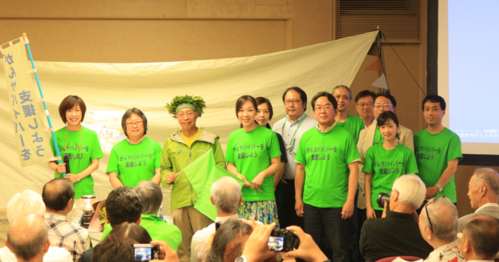次に、テルモ株式会社の中北香子さん、高木則文さん、和地恵さん、小山田香さんが登壇した。  テルモは健康経営が社是で、16カ所で、総勢27人が同行してくれた。緑のTシャツ、サバイバー支援の緑の幟を作成して、垣添の移動に合わせて支店から支店へリレーした。支援を呼びかけたのは、がん医療にかかわる商品を担当している中北さんだった。 「今回の壮大なプランを聞いて、全国の支店長に応援を呼びかけて、みなさん賛同してくれました。京都支店長が3日間ぐらい同行して、『次の週は仕事にならなかった』と言っていました。先生の歩く姿に勇気をいただき、今後も応援したいと思っています」  サバイバーでもある小山田さんは、会社や家族の理解で仕事を続けている。会社の衛生管理室の看護師から、定期健診の度にメールが届き、心が温かくなるという。 「参加するにあたり一番不安だったのは、先生は歩くのが速いということです。ウォークに備えて、会社の行き帰りにも早歩きしていました。でも当日は、先生が優しくゆっくり歩いてくれたのでついていけました」  テルモの会社を挙げての支援は、垣添にとって印象深かった。 「テルモの支店に差しかかると、緑色の稲穂が飛んでくるというのかな、そういう感じで同行する方が現れて一緒に歩いてくださいました。本当にありがたいことです」  報告会に来場されたテルモ株式会社のみなさんと。