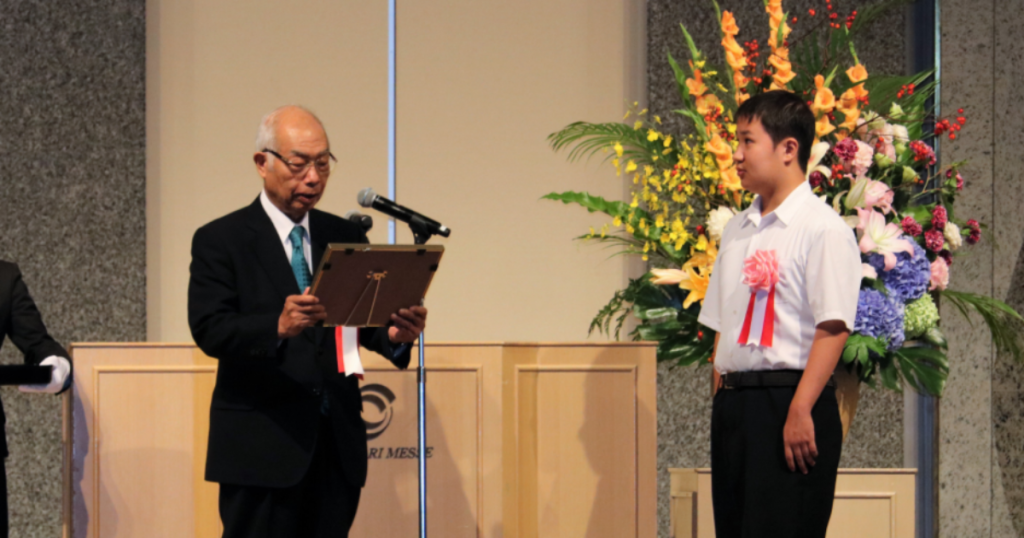 表彰を受ける中村航大さん。11月、朝日がん大賞を受賞した樋野興夫先生を名古屋に招いて、受賞記念の会を開く。