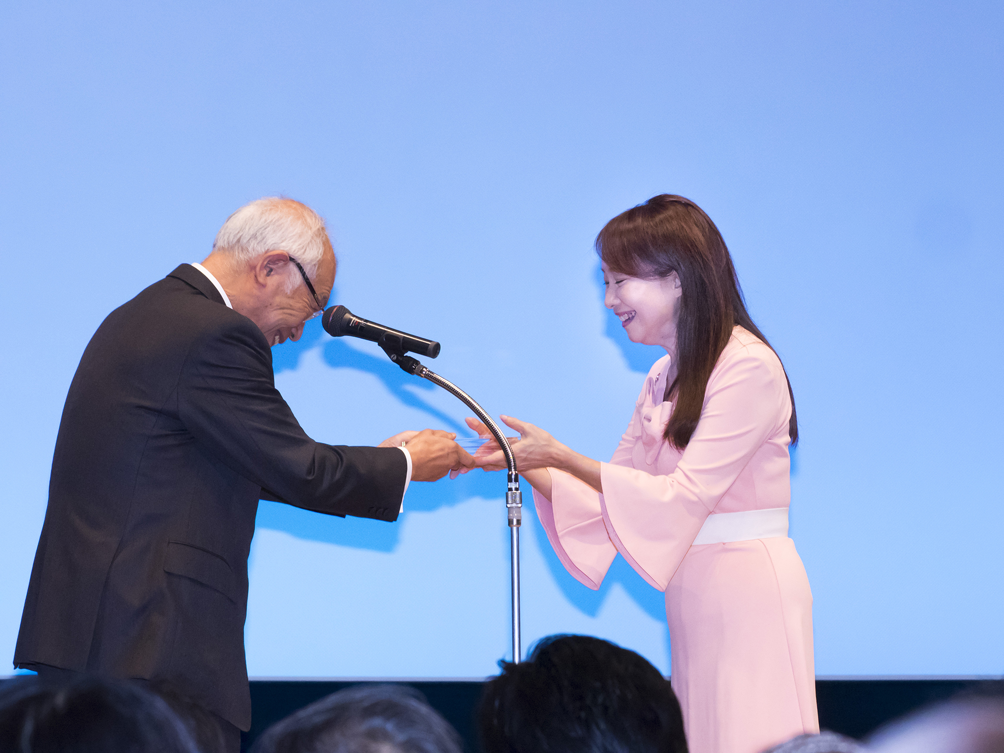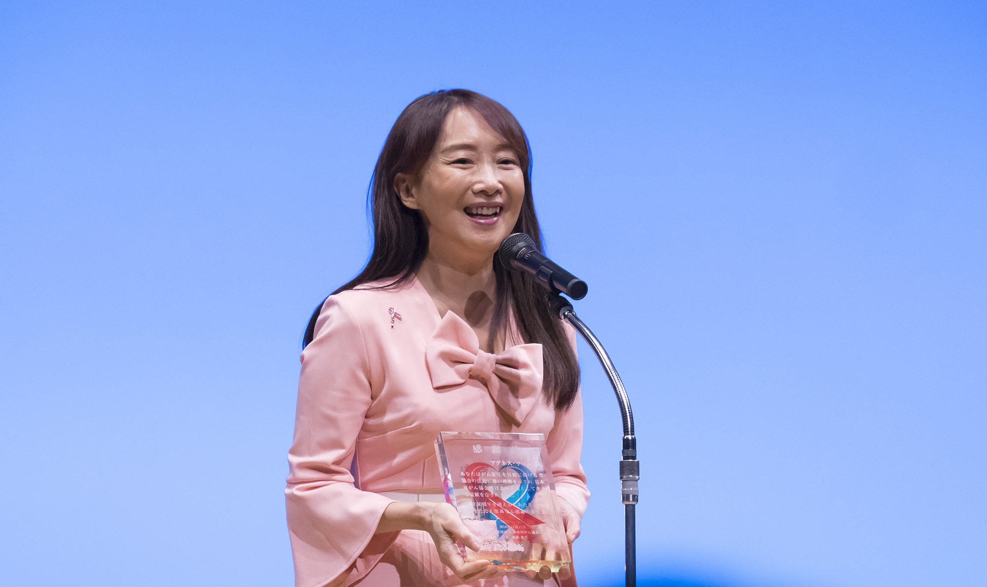 歌手・エッセイストのアグネス・チャンさんは、2008年、日本対がん協会の「ほほえみ大使」に就任した。毎年9月のがん征圧全国大会での講演、リレー・フォー・ライフ(RFL)、ピンクリボンなどさまざまな活動を展開している。一方で、ユニセフ・アジア親善大使でもある。今年は対がん協会の創立60周年。アグネスさんに、対がん活動への思いを語ってもらった。(文 日本対がん協会・渡邉奈保子、中村智志) ほほえみ大使10周年の表彰の受賞スピーチを行うアグネスチャンさん。11月11日、有楽町朝日ホールで。