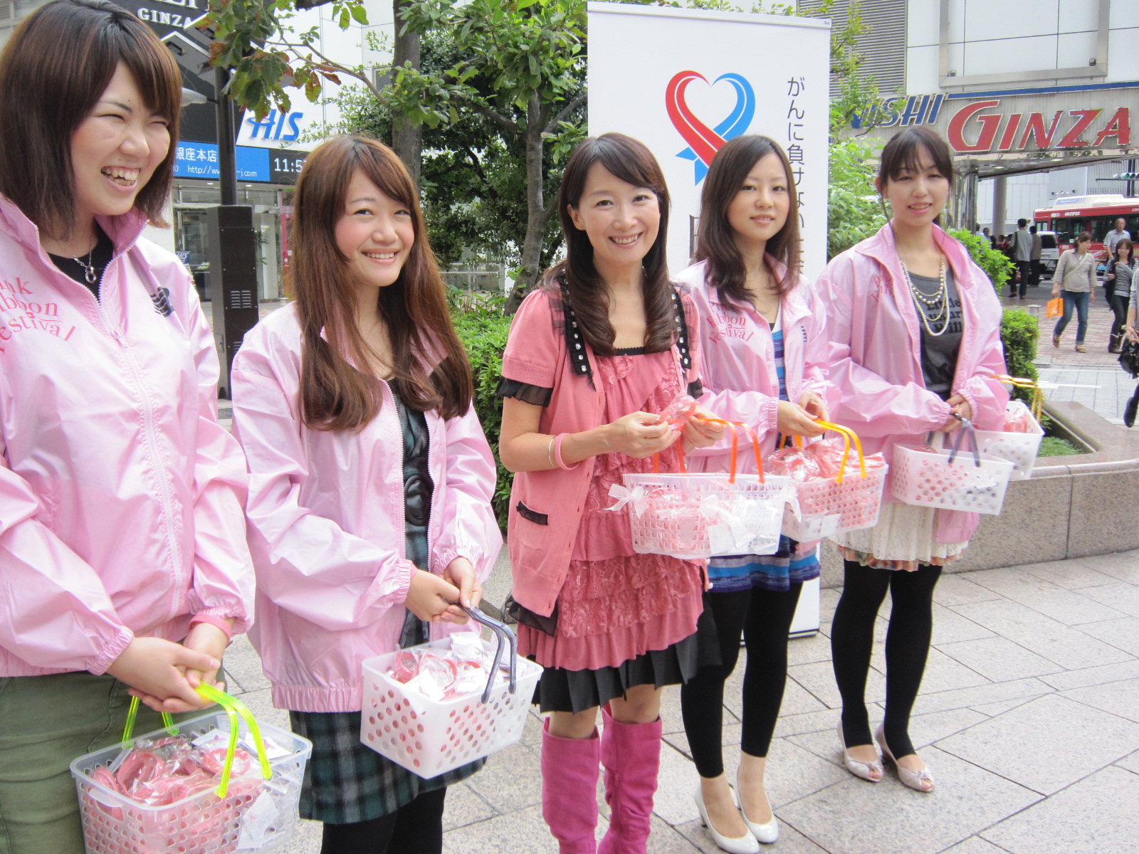 街頭でピンクリボンの啓発も行った。2010年、東京・有楽町で