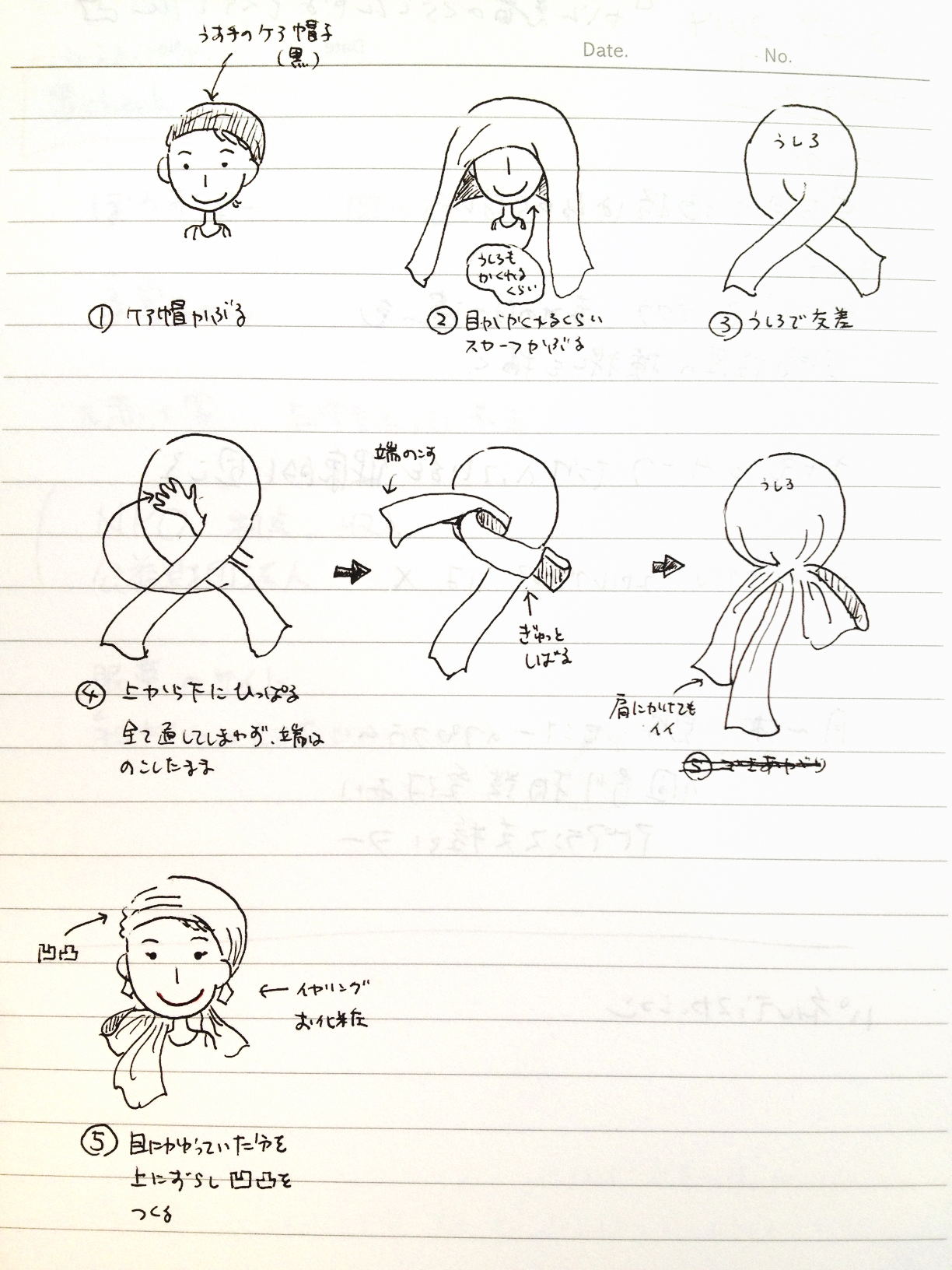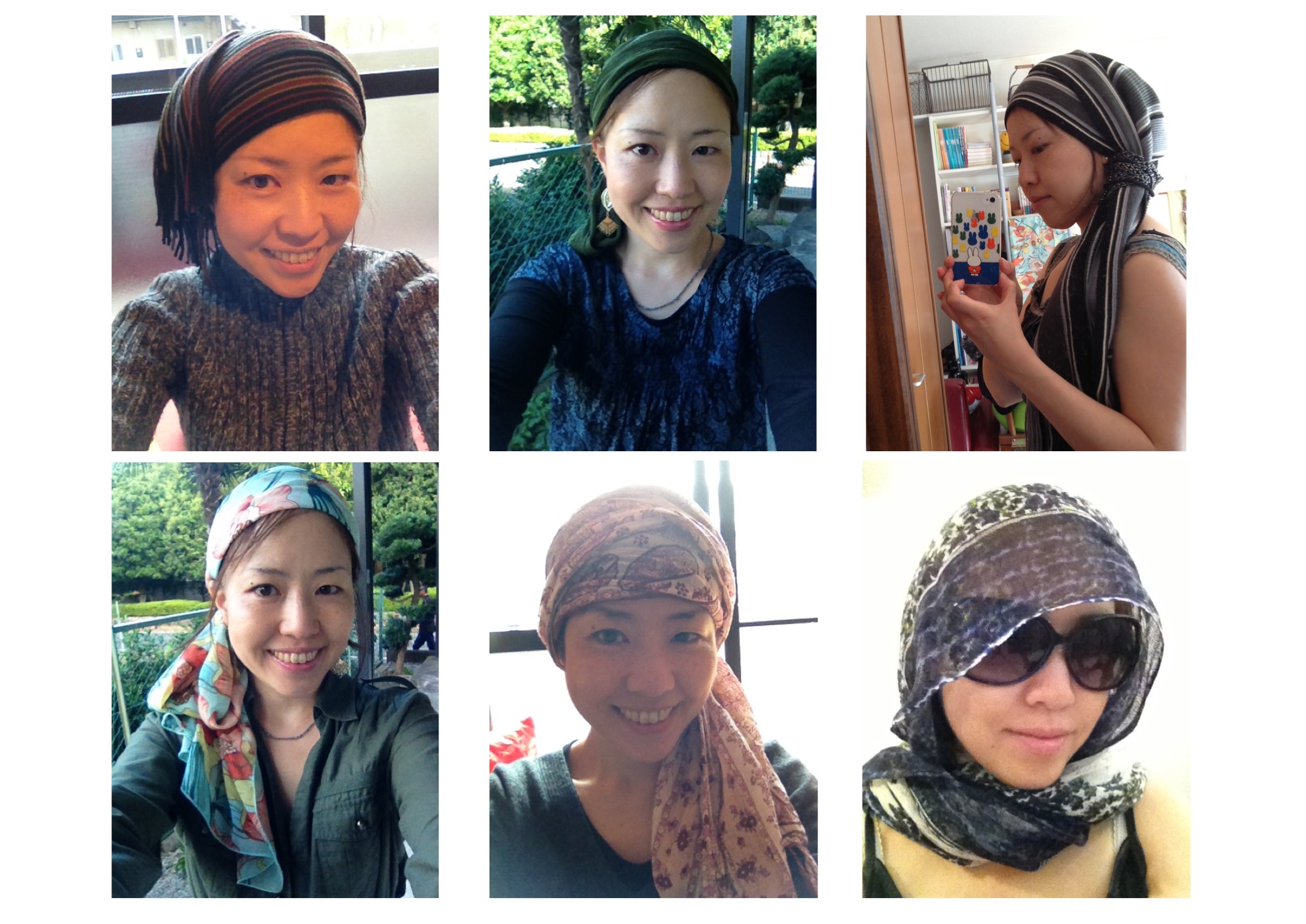 通常はどうしていたかというと、スカーフを巻いていました。髪が抜けてきたころに近所の量販店でスカーフを4本ほど買い込み、いかにかっこよく巻くかを考える日々。