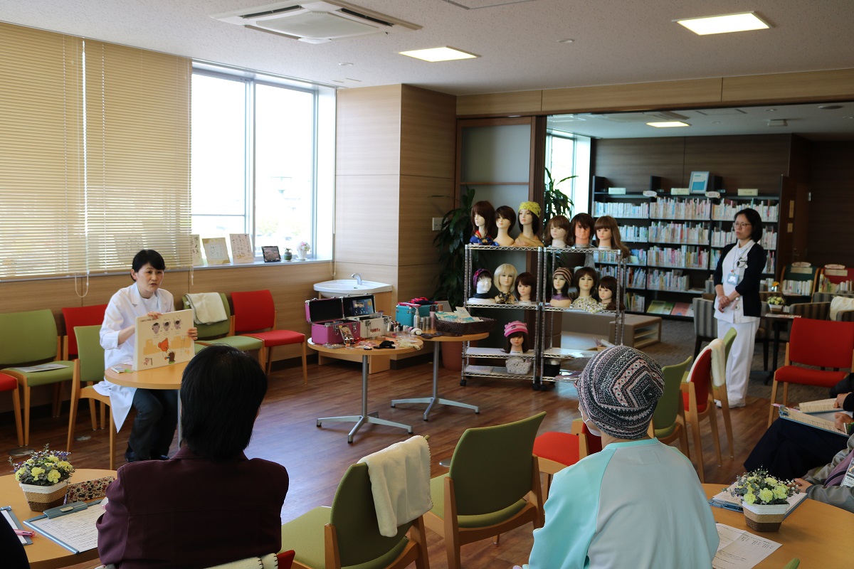 外見ケアのセミナー。紙芝居で説明しているのが乳腺外科医の清藤佐知子先生、右奥が看護師の岸田恵さん