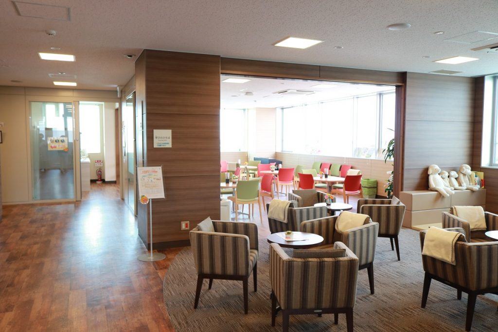 地元の砥部焼のアート、地元の書家が書いた「夢」という文字の色紙、患者が撮った病棟からの風景写真などが飾ってある。奥へ進むと、ウィッグ展示室兼相談室、マンマ製品(乳がん手術をした人向けの補正下着、人工乳房など)展示室、ベビー休憩室も備えている。