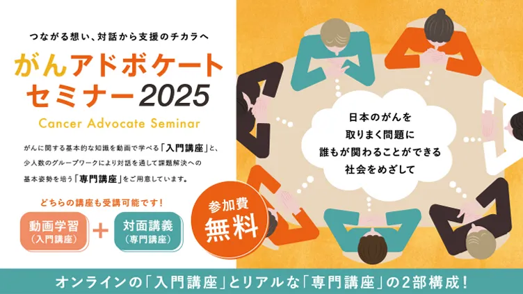 がん患者・家族の皆さんが直面する問題の解決に向けて「何か取り組みたい」と考えている方々を対象に、がんに関する基礎的な知識や問題解決のヒントを学び、行動につなげてもらうための「がんアドボケートセミナー」を毎年開催しています。日本のがんに対する認識を深め、“がんになっても希望と共に生きられる社会” の実現に向けた取り組みについて考える機会になっています。”